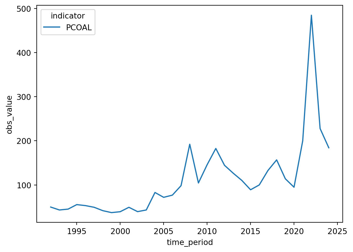 Similarly, we might search the dataframes of valid input codes for the indicator and data_transformation parameters to find the input codes for coal and index:
